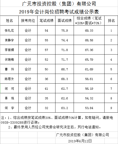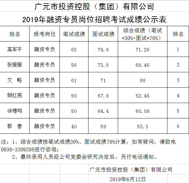广元市投资控股(集团)有限公司关于公开招聘工作人员成绩公示表